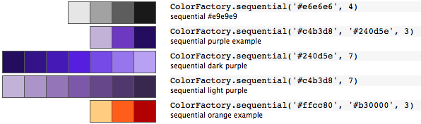 Sometimes, you just need a color to get you started: ColorFactory.random() // a random color, somewhat evenly distributed.ColorFactory.randomGray() // a random gray scale value.ColorFactory.randomHue() // given a saturation and lightness returns a random color.or primary and secondary color schemes: